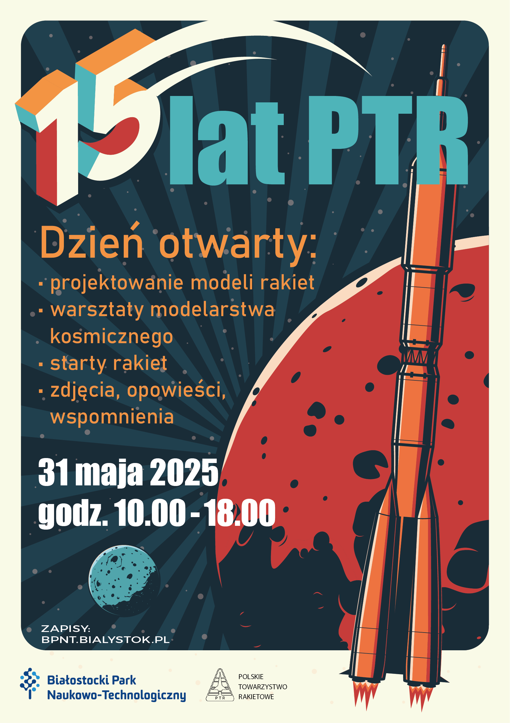 W sobotę 31 maja w godzinach 10:00-18:00 w Białostockim Parku Naukowo-Technologicznym świętować będziemy 15. urodziny Polskiego Towarzystwa Rakietowego (PTR). Zapraszamy do wspólnej zabawy wszystkich fanów modelarstwa kosmicznego, weteranów łąk, pól i poligonów, zajęć, spotkań i wyjazdów! Przynieś z domu swój model rakiety – zrobimy sobie wspólne pamiątkowe zdjęcie.