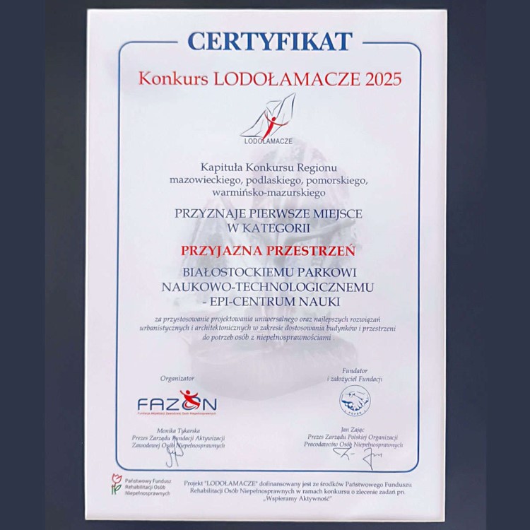 Podczas uroczystości uhonorowano pracodawców, instytucje, fundacje oraz dziennikarzy za podejmowanie wyzwań związanych z zatrudnianiem i integracją osób z niepełnosprawnościami. Wręczono statuetki w dziewięciu kategoriach. Statuetkę i certyfikat za pierwsze miejsce w kategorii “Przyjazna Przestrzeń” dla Epi-Centrum Nauki odebrali Anna Daszuta-Zalewska, Dyrektor Białostockiego Parku Naukowo-Technologicznego oraz Marek Jurzysta, Kierownik Działu Popularyzacji Nauki BPN-T.
