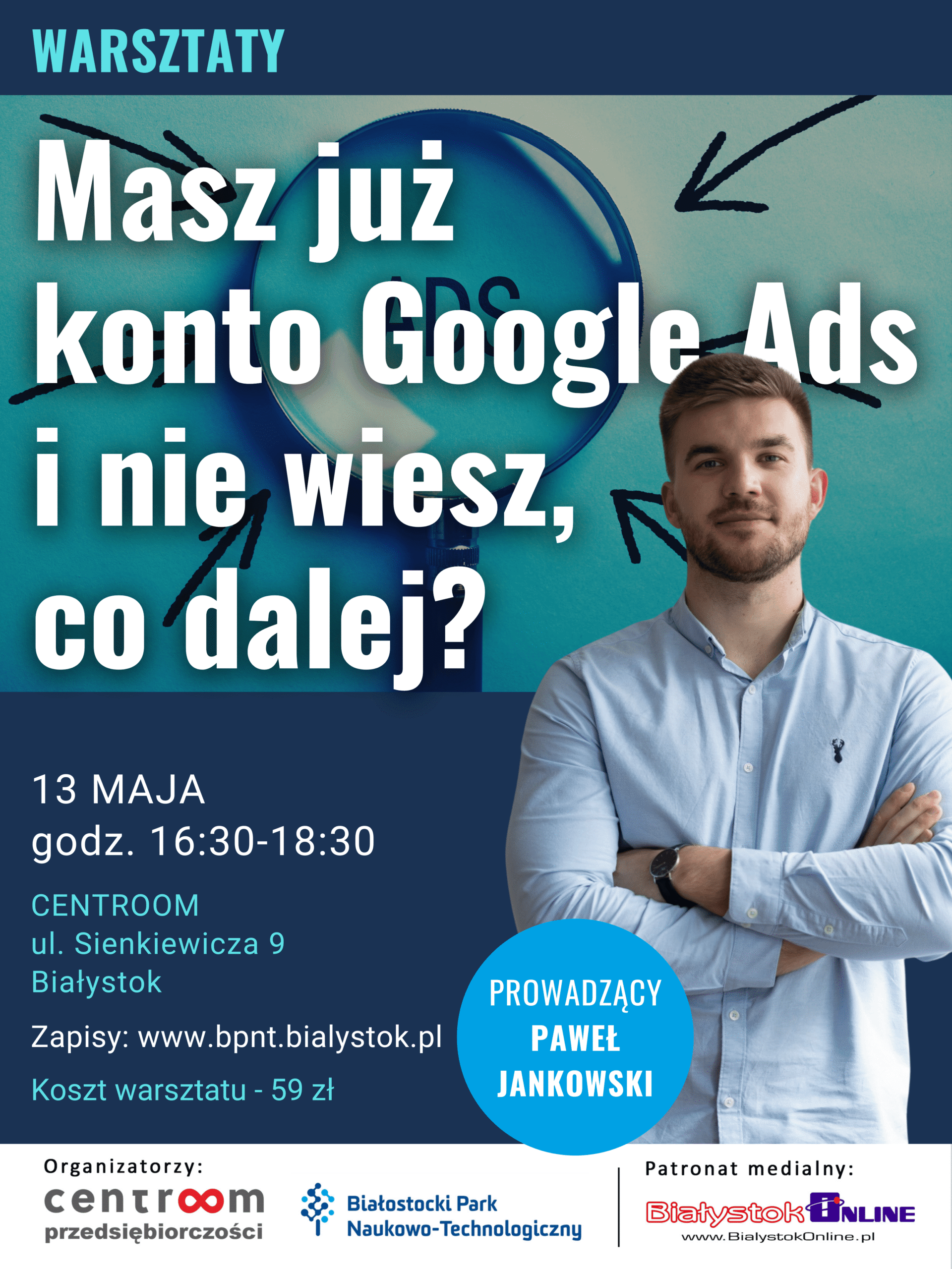 „Masz konto Google Ads i… co dalej?” – poznaj odpowiedź na to pytanie podczas warsztatu, który rozwieje Twoje wątpliwości. Już 13 maja w biurze coworkingowym Centroom odbędzie się spotkanie szkoleniowe, które pomoże Ci uporządkować konto, zrozumieć kluczowe elementy konfiguracji i przygotować solidną bazę pod skuteczne kampanie reklamowe.