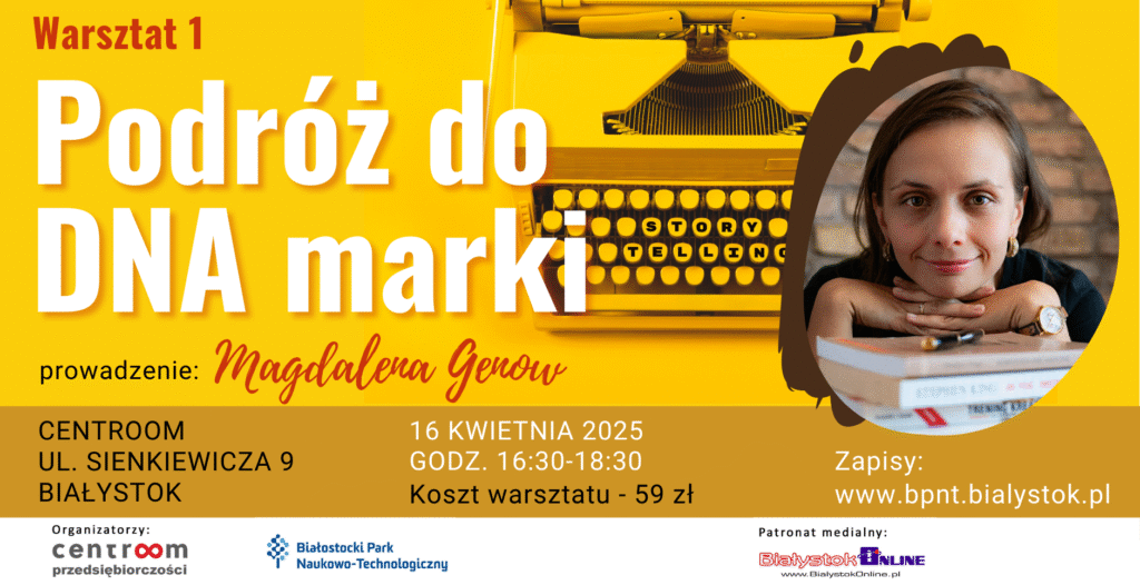Białostocki Park Naukowo Technologiczny i biuro coworkingowe Cenroom zapraszają na dwa wyjątkowe warsztaty, które pomogą Ci nie tylko odpowiedzieć na te pytania, ale przede wszystkim – znaleźć i wzmocnić fundamenty Twojej marki. Poprowadzi je Magdalena Genow – pisarka, redaktorka i ekspertka od storytellingu, była naczelna Wydawnictwa Poznańskiego, właścicielka firmy „Radość pisania”.