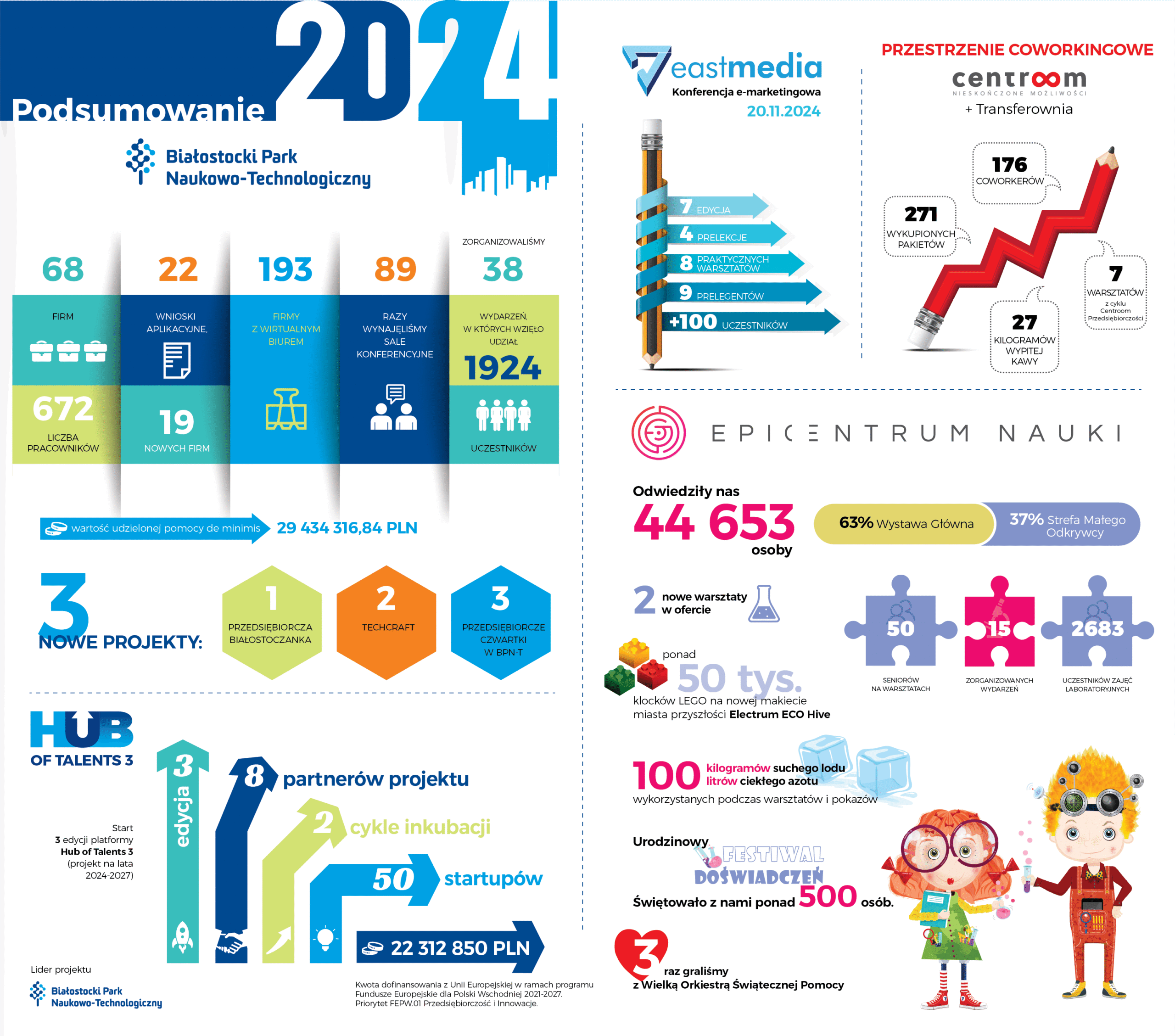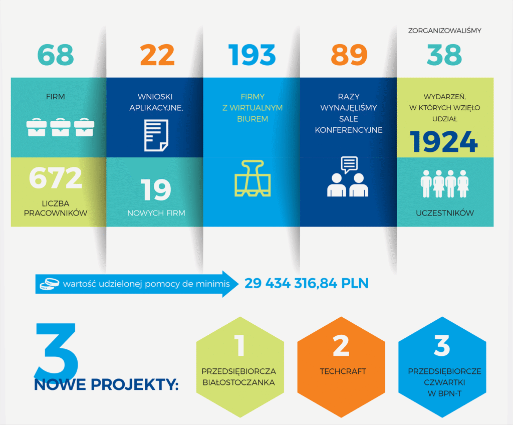 Rok 2024 upłynął w Białostockim Parku Naukowo-Technologicznym pod znakiem nowych projektów. Rozpoczęliśmy trzy zupełnie nowe inicjatywy promujące przedsiębiorczość i nowe technologie. Uruchomiliśmy również kolejną edycję platformy startowej dla nowych pomysłów – Hub of Talents 3. Oto podsumowanie ubiegłego roku w formie infografik.