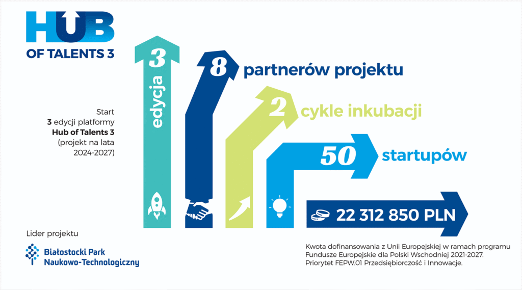 W 2024 r. uruchomiliśmy 3. edycję projektu Hub of Talents, która będzie realizowana w latach 2024-2027. Białostocki Park Naukowo-Technologiczny jest liderem tego projektu, który realizowany jest w szerokim partnerstwie obejmującym 8 instytucji.