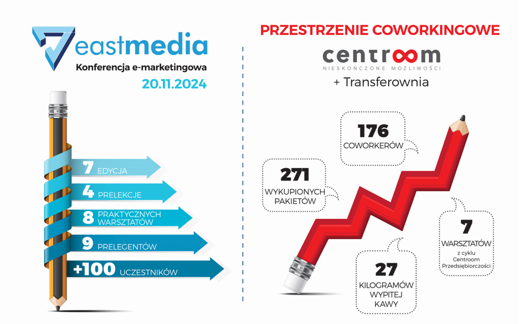 W 2024 r. zorganizowaliśmy 7. edycję konferencji e-marketingowej EastMedia. Obejmowała ona 4 prelekcje i 8 praktycznych warsztatów. Wzięło w niej udział 9 prelegentów i ponad 100 uczestników.