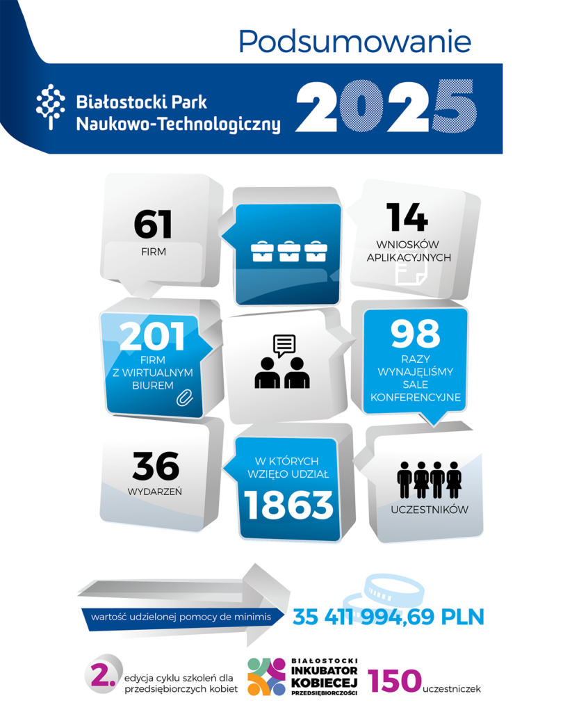 Rok 2025 był dla Białostockiego Parku Naukowo-Technologicznego czasem konsekwentnego rozwoju i wzmacniania lokalnego ekosystemu innowacji. Kontynuowaliśmy działania wspierające przedsiębiorczość, startupy oraz edukację, realizując nowe projekty i rozwijając istniejące inicjatywy. Miniony rok to wydarzenia, zaangażowane firmy i liczni odbiorcy naszych działań, które realnie przełożyły się na rozwój regionu.