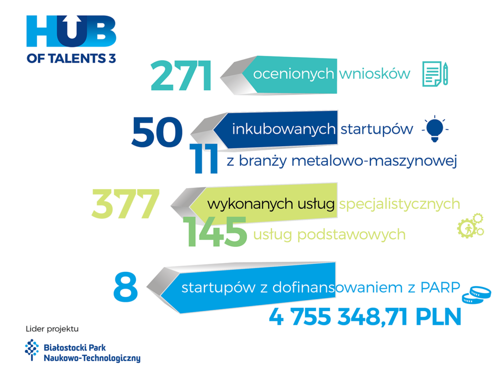 Trzecia edycja projektu Hub of Talents, która wystartowała w 2024 roku, przyniosła wymierne efekty. Inkubowaliśmy kolejne 50 startupów, w tym 11 z branży metalowo-maszynowej. Oceniliśmy 271 wniosków, zrealizowaliśmy 377 usług specjalistycznych oraz 145 usług podstawowych. 8 startupów uzyskało dofinansowanie z PARP na łączną kwotę 4 755 348,71 zł.