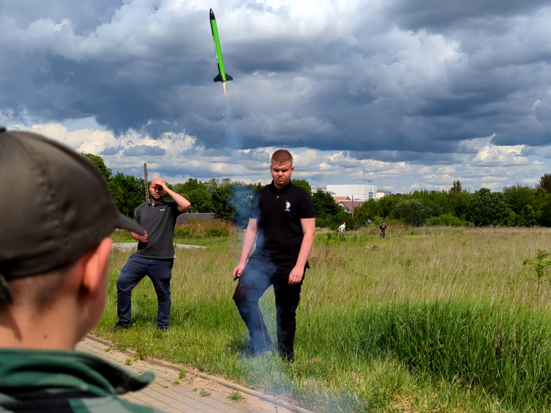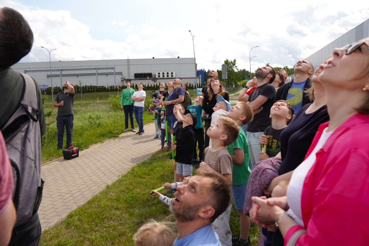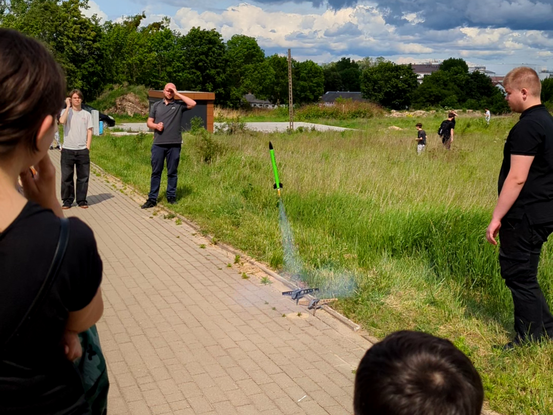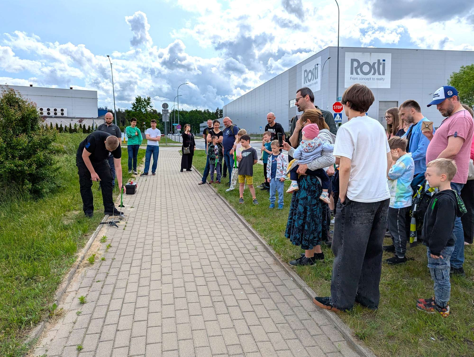 Nie mogło oczywiście zabraknąć tego, co najważniejsze – startów modeli rakiet SCOUT, które odbyły się na pobliskim otwartym terenie. Widok wznoszących się w niebo konstrukcji wywołał entuzjazm nie tylko wśród dzieci – dorośli również nie kryli ekscytacji. Po udanych lądowaniach każdy uczestnik mógł zabrać swoją rakietę do domu – nie tylko jako pamiątkę, ale i zaproszenie do dalszej zabawy z nauką.